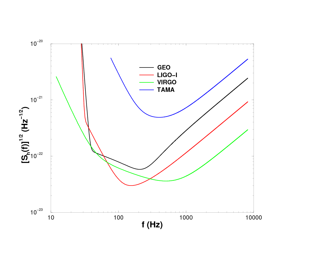 This test code makes four successive calls to the function LALNoiseSpectralDensity() successively passing a pointer to the functions LALGEOPsd(), LALLIGOIPsd(), LALTAMAPsd() and LALVIRGOPsd(). The function LALNoiseSpectralDensity() returns the power spectrum in units \(\mathrm{Hz}^{-1}\) while the test code NoisePSDTest.c outputs the amplitude spectrum in units \(\mathrm{Hz}^{-1/2}\) The figure below shows the output of the test code.