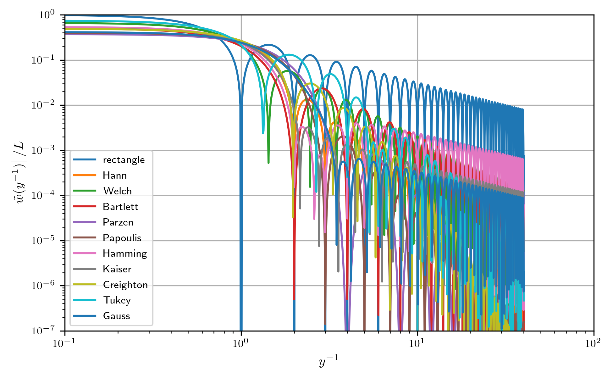 The Fourier transforms of the windows are shown as functions of \(1 / y\) in this figure, showing frequency behaviour of various windows as functions of the inverse of the normalized independend variable \(y\), choosing \(\beta = 6\) for the Kaiser window, \(\beta = 2\) for the Creighton window, \(\beta = 0.5\) for the Tukey window, and \(\beta = 3\) for the Gauss window.