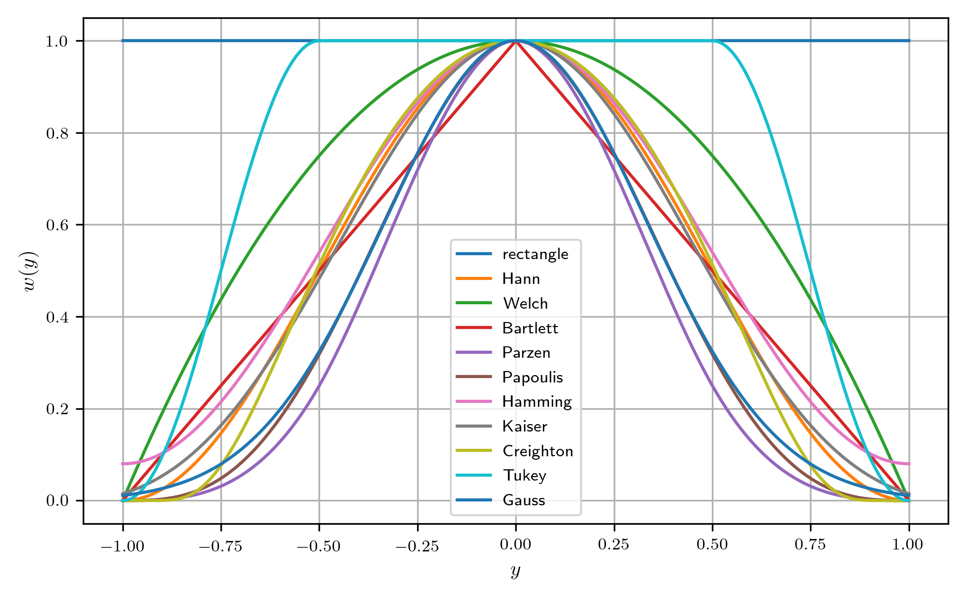 These window functions are shown in this figure, showing various windows as functions of the normalized independend variable \(y\), choosing \(\beta = 6\) for the Kaiser window, \(\beta = 2\) for the Creighton window, \(\beta = 0.5\) for the Tukey window, and \(\beta = 3\) for the Gauss window.