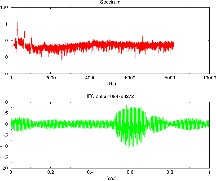 This will search in directory ./h1 for frame files containing the channel H2:LSC-AS_Q and pipe the data starting at 693768272 GPS seconds and 0 GPS nanonseconds to xmgr in segments containing 16384 points until 1 seconds of data has been reviewed. The data is highpass filtered to above 300 Hz with an attenuation of \(0.1\); the output is shown in this figure.