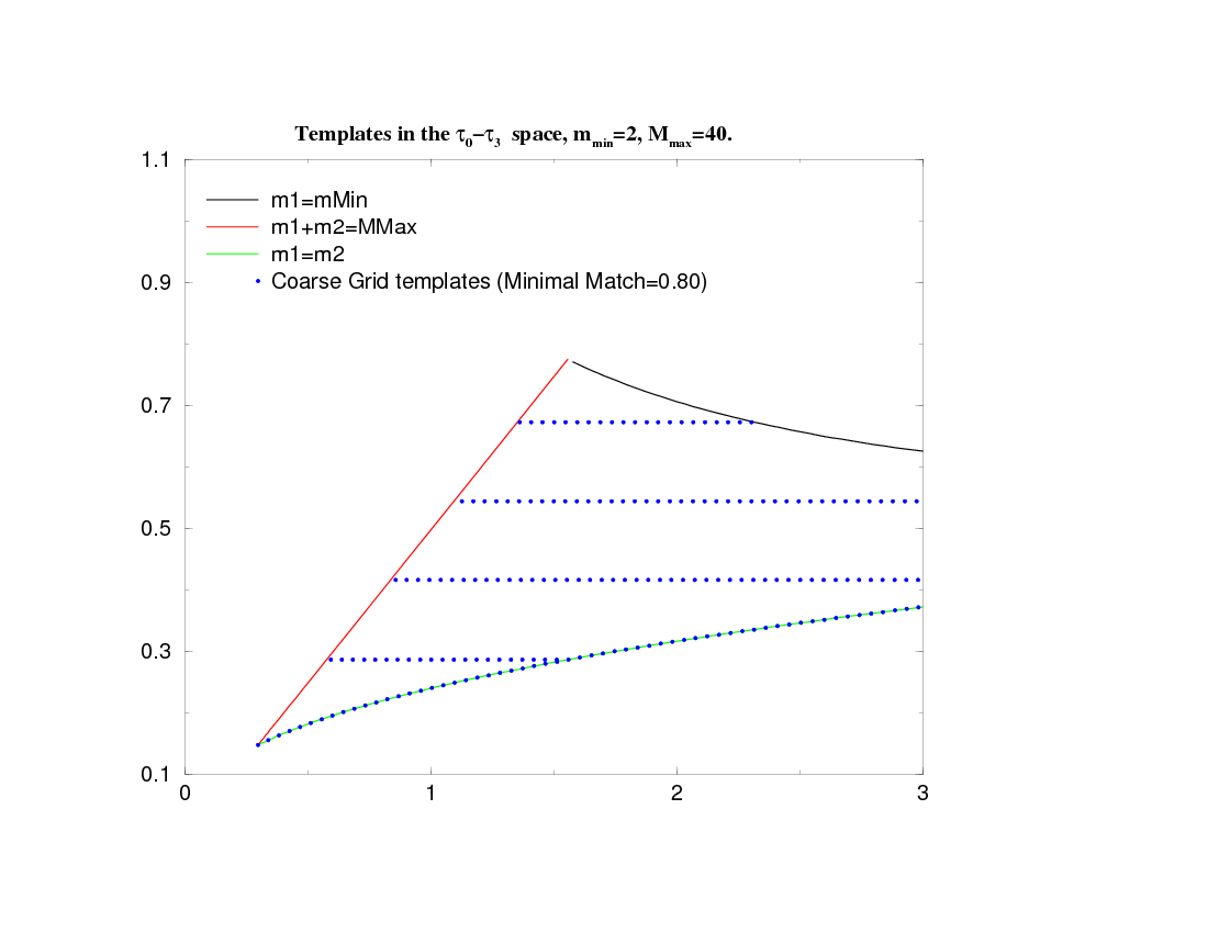In the second stage, the algorithm begins again at the point \((\tau_0^\mathrm{min}, \tau_3^\mathrm{min}),\) corresponding distance between templates \((D\tau_0^\mathrm{min}, D\tau_3^\mathrm{min}),\) and chooses a rectangular lattice of templates in the rectangular region defined by \((\tau_0^\mathrm{min}, \tau_3^\mathrm{min})\) \((\tau_0^\mathrm{max}, \tau_3^\mathrm{min})\) \((\tau_0^\mathrm{max}, \tau_3^\mathrm{max})\) and \((\tau_0^\mathrm{min}, \tau_3^\mathrm{max})\). The implementation of the algorithm along the equal mass curve and in a rectangular lattice in the rest of the parameter space is shown plotted in this figure, where the templates chosen are represented as points.