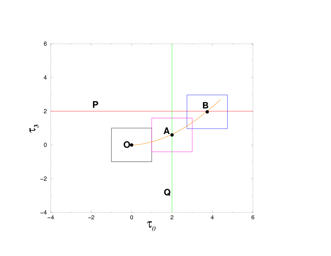 The template next to \((\tau_0^{(n)},\tau_3^{(n)}),\) on the equal mass curve, must lie either along \(PB\) or along \(QA\) (cf. this figure in order that all the signals that may lie on \(OAB\) are spanned by at least one of the two templates. Clearly, if we were to place the \((n+1)\)\ th template at \(B,\) some of the signals won't have the required minimal match. However, placing the \((n+1)\)\ th template at \(A\) suffices our requirement. (Note, however, that there is no guarantee that this will always work; it works only if the curve along which templates are being laid is a slowly varying function.) To locate the \((n+1)\)\ th template we compute the following pairs of coordinates: