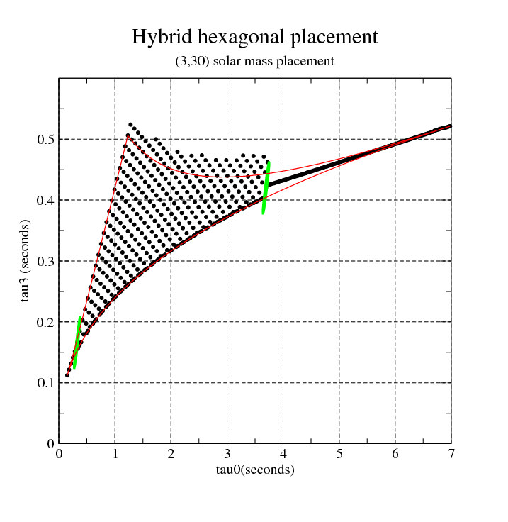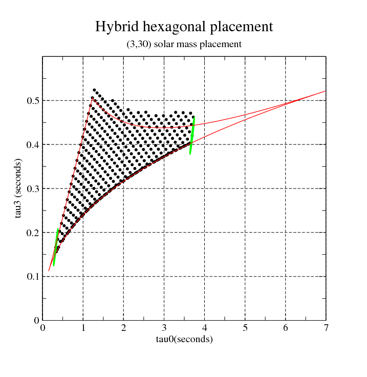 The algorithm is identical to the hexagonal placement. However, once a template covers both the equal mass line and the upper boundary, then the hexagonal placement stops. So, an additional placement is needed to finalise the bank. In principle the placement needs to be completed on bothe side of the template bank, at low mass and high mass. So, we should start from the two templates which covers the two boundaries and populate the parameter space along a bissectrice.